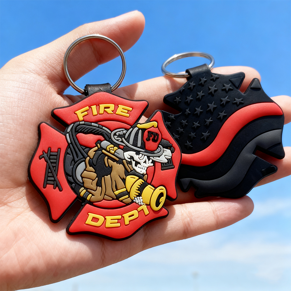 firefighter keychain, custom PVC keychain, double-sided rubber keychain, personalized logo key ring, firefighter souvenir gift, promotional key holder, custom emergency services keychain, soft PVC keyring manufacturer